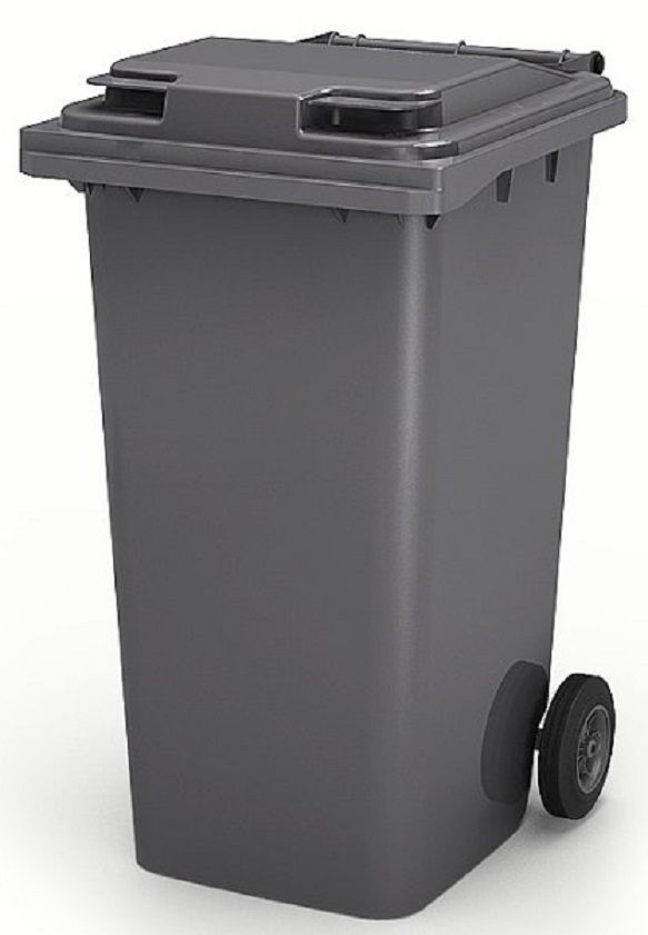 - Пластиковый мусорный контейнер 120 л. с крышкой, на колесах и педальным приводом.