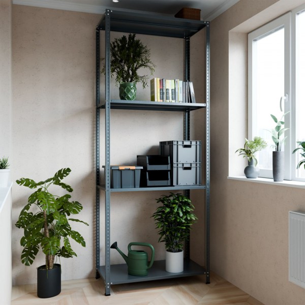 - Выполненный в лаконичном дизайне в цвете темно-серый антрацит (RAL 7015), стеллаж прекрасно подходит для разных помещений, в том числе для дома и офиса. А благодаря своим компактным размерам его легко можно разместить в небольшом гараже или на балконе.